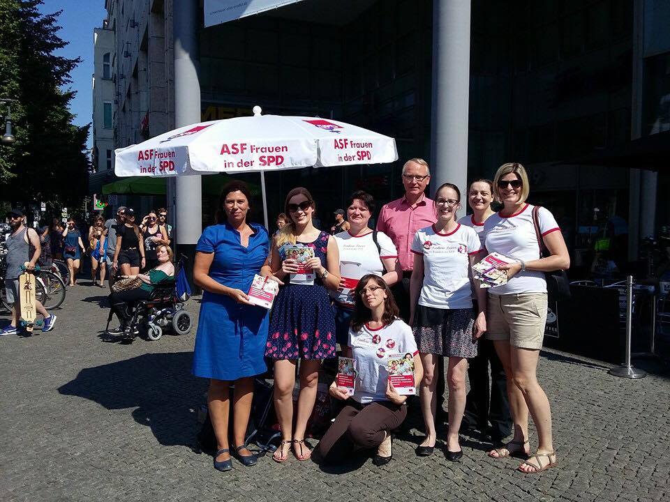 Die ASF (Arbeitsgemeinschaft sozialdemokratischer Frauen in der SPD) war heute den ganzen Tag in Berlin unterwegs. Sie setzte mit verschiedenen Aktionen ein Zeichen für eine Fortsetzung der erfolgreichen Frauenpolitik mit der SPD und Michael Müller als Regierenden Bürgermeister nach der Wahl am 18. September. Auch die ASF-Pankow beteiligte sich mit einem Infostand, an dem unsere Bildungssenatorin Sandra Scheeres, unsere Bezirksbürgermeisterkandidatin für Pankow Rona Tietje, unsere Direktwahlkreiskandidatin Dr. Clara West und der Bundestagsabgeordnete Klaus Mindrup teilnahmen. Es wurden lebendige Gespräche mit Bürgerinnen und Bürgern geführt und ASF-Forderungen, wie zum Beispiel: Gleicher Lohn für gleichwertige Arbeit, sowie die Vereinbarkeit von Familie und Beruf durch neue Arbeitszeitmodelle, unterstützt. Ulrike Rosensky