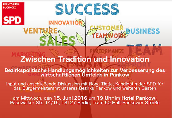Zum Thema "Zwischen Tradition und Innovation - bezirkspolitische Möglichkeiten zur Verbesserung des wirtschaftlichen Umfelds" veranstaltet die SPD Französisch Buchholz am kommenden Mittwoch, 15. Juni um 19 Uhr eine Podiumsdiskussion im Hotel Pankow in der Pankower Straße 29. Gemeinsam mit Unternehmern, Freiberuflern und Interessierten soll darüber diskutiert werden, wie die Bedingungen für Gewerbetreibende und für die Neuansiedlung von Unternehmen in Pankow verbessert werden können. Neben Vertretern aus der Wirtschaft wird die SPD-Kandidatin für das Amt der Pankower Bürgermeisterin, Rona Tietje, auf dem Podium Platz nehmen. Moderiert wird das Gespräch von Toralf Ließneck (Kandidat auf der SPD Liste zur BVV Pankow).